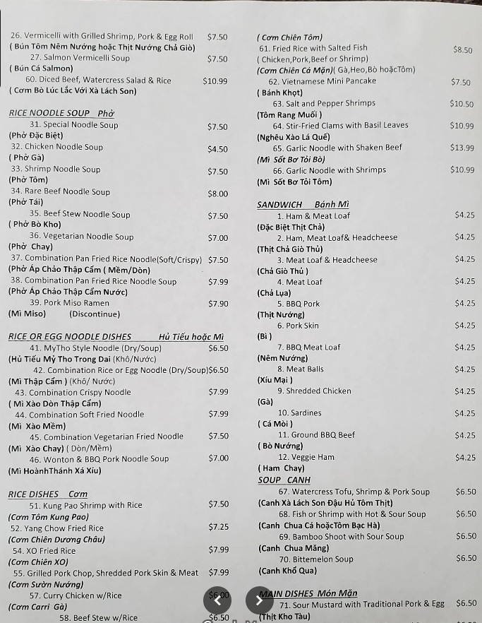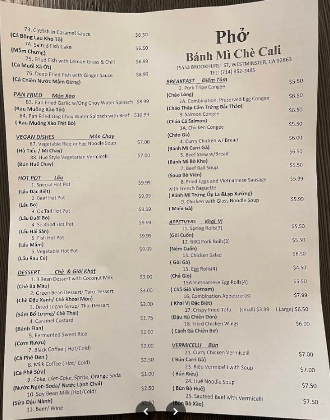 Welcome to Banh Mi & Che Cali, your go-to spot in Westminster, CA for the best of authentic Vietnamese cuisine! Our menu is packed with flavorful Banh Mi sandwiches, traditional Che desserts, and an assortment of other mouthwatering dishes that bring the authentic taste of Vietnam to you. Whether you're craving a hearty sandwich or a refreshing bowl of Che, we've got you covered. Come join us for a delightful dining experience in a cozy and welcoming atmosphere!